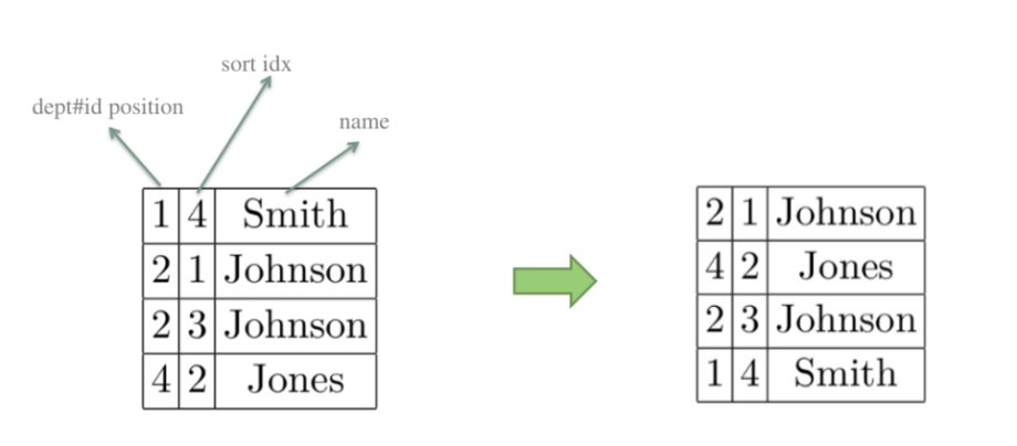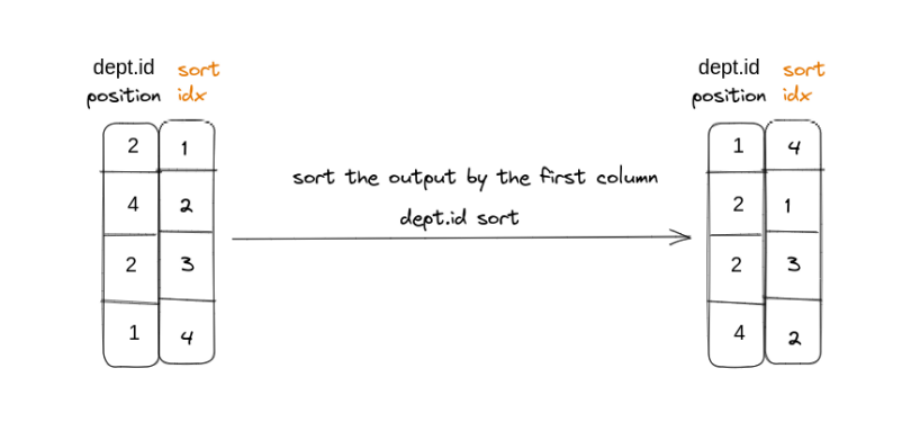 最后,为了保持原SQL语义的一致性,我们对数据结构再次排序,这次是按最初添加到连接输出的列,将当前数据结构恢复为原始连接顺序(以便与另一个表的连接输出相匹配):