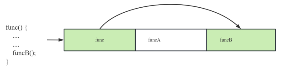 在介绍内联前,我们先要了解代码空洞的概念。如下图一段程序编译后,二进制可执行文件中依次包含 func funcA funcB 函数。在执行 func 函数时调用了 funcB 函数,此时需要 CPU 跳过一段内存空间加载并执行 funcB 函数。在本次执行过程中,我们称跳过的部分为 代码空洞。在执行过程中代码空洞越小,代码指令加载效率越高。