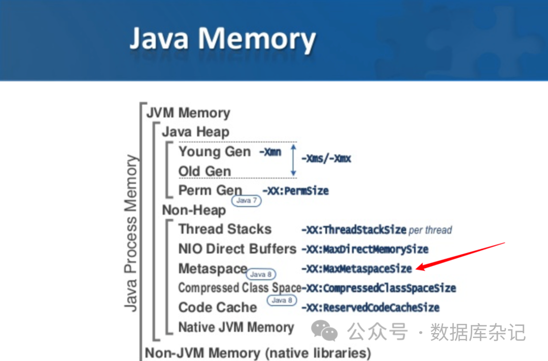 上边这张图也能说明一下总的计算方法。Metaspace属于Non-heap的空间。也就是说,在计算总的开销时,它增加了,Java heap那部分就得减小。