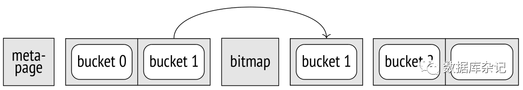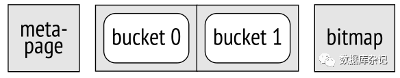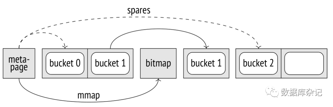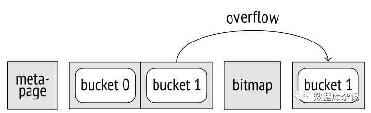哈希索引中有四种页面:元页面meta page(第0页),包含静态分配的控制信息;主桶页;溢出页;位图页, 用于跟踪已被释放并可被重用的溢出页。出于寻址的目的,位图页被视为溢出页的一个子集。
