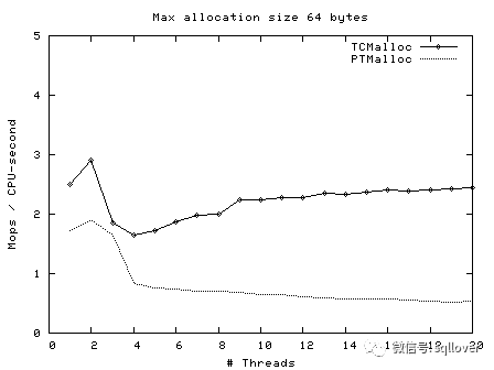 下图是 TCMalloc 作者给出的性能测试数据,可以看到线程数越多,二者的速度差距越大。所以,当应用场景涉及大量的并发线程时,换成 TCMalloc 库也更有优势!