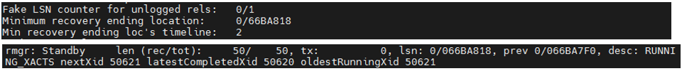 [11:23:08-postgres@centos2:/pgccc/pgdata/pg_wal]$ pg_waldump 00000001000000010000002A | grep 2A000148pg_waldump: fatal: error in WAL record at 1/2A0001F8: invalid record length at 1/2A000230: wanted 24, got 0rmgr: Standby len (rec/tot): 50/ 50, tx: 0, lsn: 1/2A000148, prev 1/2A000110, desc: RUNNING_XACTS nextXid 1461 latestCompletedXid 1460 oldestRunningXid 1461rmgr: XLOG len (rec/tot): 114/ 114, tx: 0, lsn: 1/2A000180, prev 1/2A000148, desc: CHECKPOINT_ONLINE redo 1/2A000148; tli 1; prev tli 1; fpw true; xid 0:1461; oid 31466; multi 1; offset 0; oldest xid 727 in DB 1; oldest multi 1 in DB 1; oldest/newest commit timestamp xid: 0/0; oldest running xid 1461; online