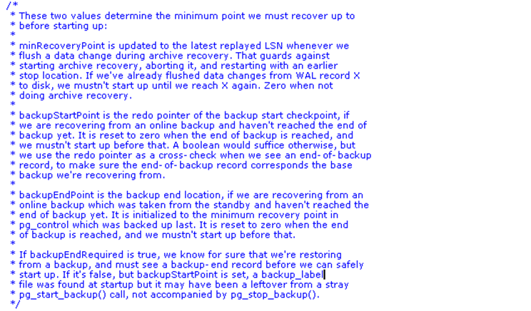 /** System status indicator. Note this is stored in pg_control; if you change* it, you must bump PG_CONTROL_VERSION*/typedef enum DBState{DB_STARTUP = 0,DB_SHUTDOWNED,DB_SHUTDOWNED_IN_RECOVERY,DB_SHUTDOWNING,DB_IN_CRASH_RECOVERY,DB_IN_ARCHIVE_RECOVERY,DB_IN_PRODUCTION} DBState;