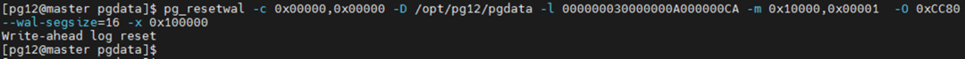pg_resetwal -c 0x00000,0x00000 -D /opt/pg12/pgdata -l 000000030000000A000000CA -m 0x10000,0x00001 -O 0xCC80 --wal-segsize=16 -x 0x100000