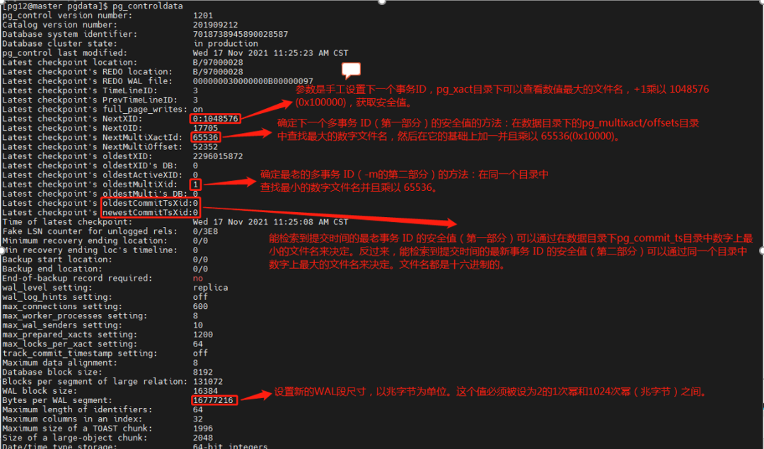 [15:52:02-postgres@centos2:/pgccc/pgdata/global]$ pg_controldata $PGDATApg_control version number: 1300Catalog version number: 202107181Database system identifier: 7138432685960386315Database cluster state: in productionpg_control last modified: Sun 11 Dec 2022 03:52:02 PM CSTLatest checkpoint location: 1/2C000028Latest checkpoint's REDO location: 1/2C000028Latest checkpoint's REDO WAL file: 00000001000000010000002CLatest checkpoint's TimeLineID: 1Latest checkpoint's PrevTimeLineID: 1Latest checkpoint's full_page_writes: onLatest checkpoint's NextXID: 0:1048576Latest checkpoint's NextOID: 31466Latest checkpoint's NextMultiXactId: 65536Latest checkpoint's NextMultiOffset: 52352Latest checkpoint's oldestXID: 727Latest checkpoint's oldestXID's DB: 1Latest checkpoint's oldestActiveXID: 1461Latest checkpoint's oldestMultiXid: 1Latest checkpoint's oldestMulti's DB: 0Latest checkpoint's oldestCommitTsXid:0Latest checkpoint's newestCommitTsXid:0Time of latest checkpoint: Sun 11 Dec 2022 03:49:51 PM CSTFake LSN counter for unlogged rels: 0/3E8Minimum recovery ending location: 0/0Min recovery ending loc's timeline: 0Backup start location: 0/0Backup end location: 0/0End-of-backup record required: nowal_level setting: replicawal_log_hints setting: offmax_connections setting: 100max_worker_processes setting: 8max_wal_senders setting: 10max_prepared_xacts setting: 0max_locks_per_xact setting: 64track_commit_timestamp setting: offMaximum data alignment: 8Database block size: 8192Blocks per segment of large relation: 131072WAL block size: 8192Bytes per WAL segment: 16777216Maximum length of identifiers: 64Maximum columns in an index: 32Maximum size of a TOAST chunk: 1996Size of a large-object chunk: 2048Date/time type storage: 64-bit integersFloat8 argument passing: by valueData page checksum version: 0Mock authentication nonce: aaa8abf569631ec60ba05e3f625495da70007738b831e46e1cfda0d26c370987