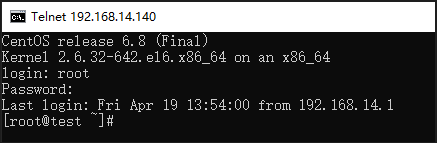 最后,我们可以在命令行中输入telnet 192.168.14.140(这里的IP地址应该是你的服务器的地址)来验证是否能够成功登录。