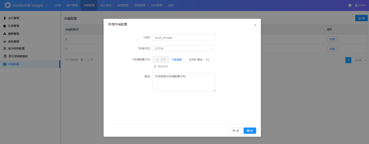 首先在(资源管理→存储配置→新增)中新增存储配置;