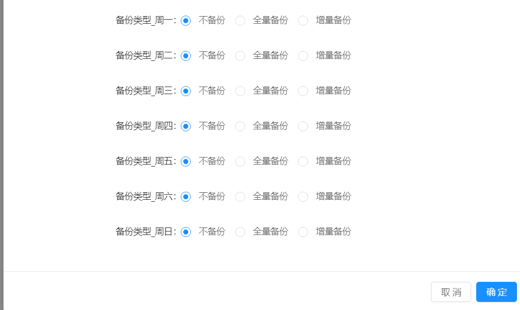 周一至周日的备份模式 | 如图样例配置,周一至周六做增量备份,周日做一次全量备份。如果在做增量备份时,之前没有做过全量备份,本次增量备份自动转为全量备份。 |