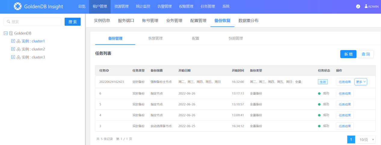 4.若对指定日期备份任务进行调整(租户管理→集群实例→备份恢复→更多→调整)。