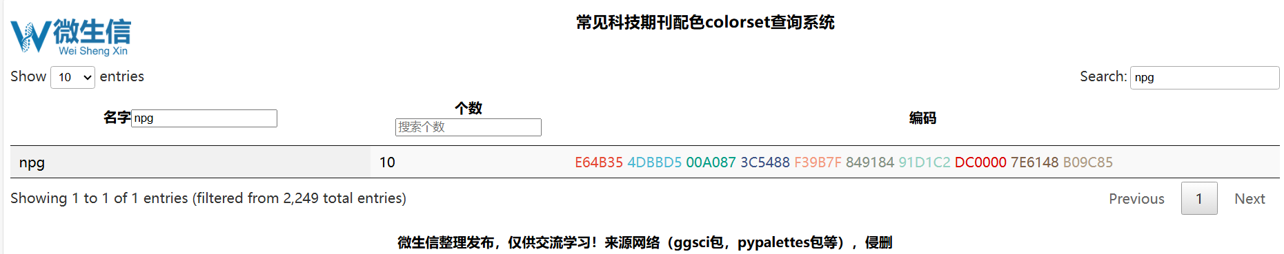 如何你想直接使用某个颜色集,可以在第一列上面的名字搜索框中使用颜色集的名字进行查询,下图展示了使用npg查询的结果。