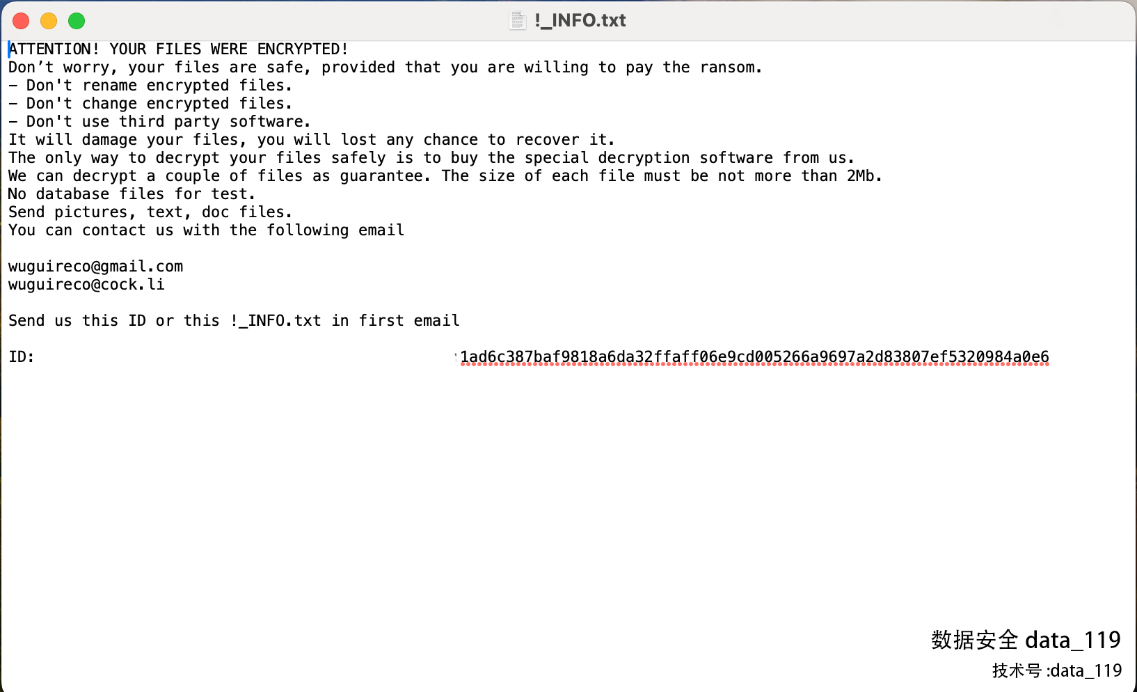 被该病毒家族加密后主要特征,在我们的正常数据格式DOCX、xlsx、pdf、mdf、dbf、bak、jpg后面生成后缀名称.baxia,列如:1.JPG.baxia、1.MDF.baxia、1.XLSX.baxia、1.BAK.baxia、1.DBF.baxia、1.PDF.baxia、1.DOCX.baxia导致我们的文件无法打开读取写入,同时该病毒还会在我们的电脑桌面及文件夹中留下勒索信件!_INFO.txt。