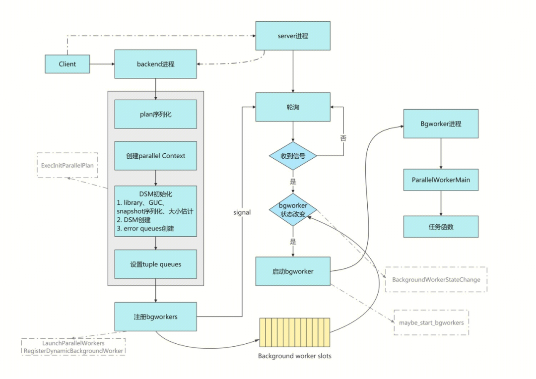 1. Client 连接到 server 以后 server 进程为其创建一个 backend 进程,banckend 进程在生成执行计划的过程中识别出是否需要并行执行,如果能并行执行就会创建 Background Worker 进程。