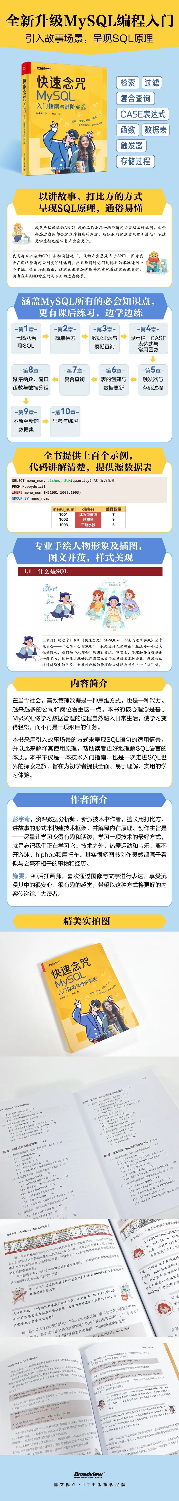 《快速念咒:MySQL入门指南与进阶实战》是一本循序渐进、注重实操,并且活泼有趣的技术书,相信你将从中获益匪浅!