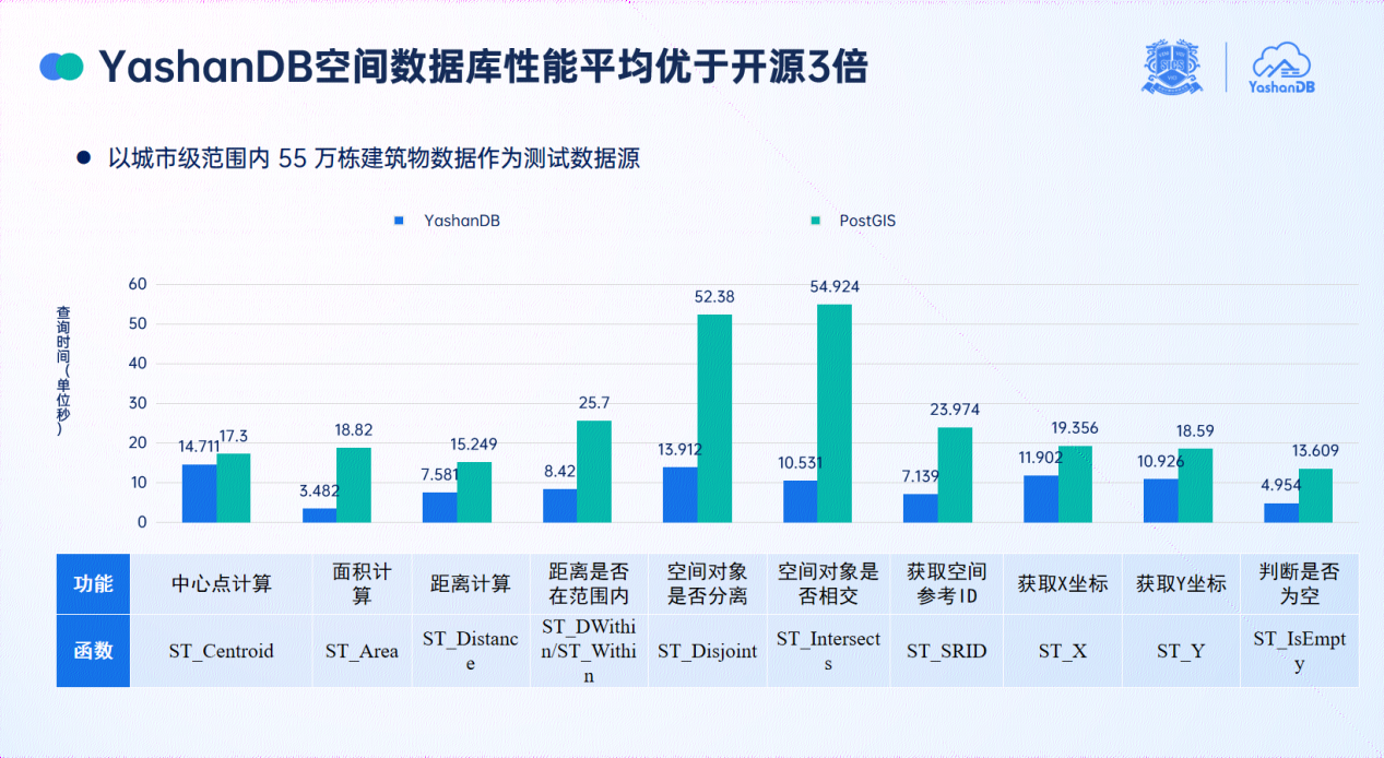优异的性能。以一个深圳市城市级范围55万栋建筑物数据集上进行了对比测试,YashanDB在常用的空间计算函数上的性能是开源PostGIS的三倍,这表明YashanDB在处理大规模空间数据时的高效性和可靠性。