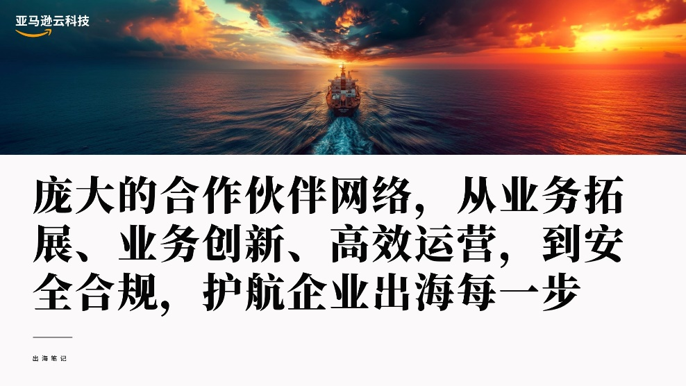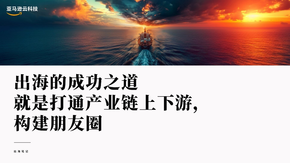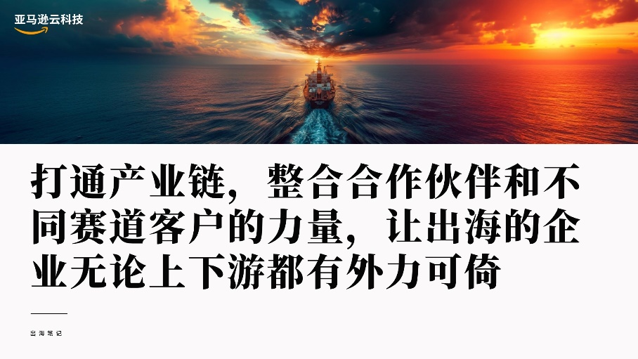 在中国,亚马逊云科技一面整合出海企业,一面拉起6000家中国合作伙伴,打通产业合作,帮助中国企业出海打造全球行业竞争力。在全球,联合亚马逊云科技超过13万的全球合作伙伴,亚马逊云科技将伴随中国企业全程陪跑,“扶上马,送一程”,实现融入式共赢。不论出海走到哪里,亚马逊云科技都有强大的“朋友圈”支持,让出海企业无论产业链上下游都有外力可依仗,畅行海外,决胜千里。
