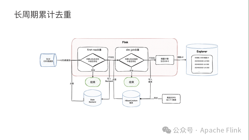 在这个链路里为什么不完全依赖于 Flink 的状态来完成去重动作呢?会有两点的考虑:第一是状态,如果缓存全量的用户数据,对Flink作业的本地存储和计算性能都会有比较大的挑战。第二,从任务的鲁棒性角度考虑。一旦数据出现错误,需要回拉重算时,因为上游的流数据无法保存完整活动周期的全量数据,所以它的状态无法全量重建。一旦出现数据回刷,如果完全依赖 Flink 更新状态,会无法满足要求。