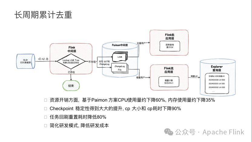 第一,资源开销方面,基于 Paimon 方案 CPU 使用量约下降 60%, 内存使用量约下降 35%。第二,Checkpoint 稳定性得到大大的提升,Checkpoint 大小和耗时下降 90%,任务回刷重置耗时降低 80%。最后是通过简化研发模式, 降低研发成本,用户只要定义 Paimon 表、插入 Paimon 表、消费 Paimon 表,下游做累积聚合,就可完成原来这套业务语义的开发。