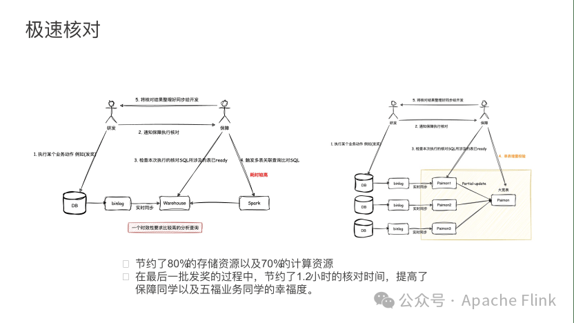 但通过 Paimon,利用 Paimon 的 Partial-update, 如上图右侧所示,在同步过程中,可直接将所需要校验的多个 DB 的数据打成一张大宽表。