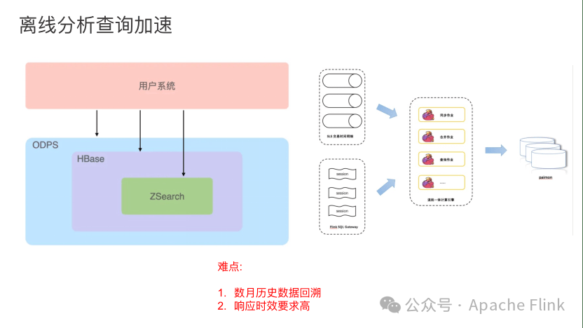 第二,它类似于 ad-hoc 系统,对响应要求较高。之前链路为了加速过程,做了非常多缓存,包括利用 Elasticsearch(Zsearch)、 HBase 和 ODPS。ODPS 里会存储最终的明细数据,Elasticsearch、 HBase会存储各个层需加速的数据。目前这套体系已经改造成上图右侧Paimon的模式,业务数据会由Flink流任务实时同步写入 Paimon 分区表,并且周期性的提交 Sort Compact 调度任务,分区数据按指定的查询键排序。前台的工单系统经由 Flink SQL Gateway 提交查询任务,直接查询 Paimon 表的数据。