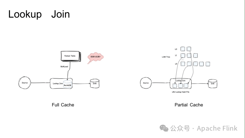 Lookup Join 是 Paimon 上支持维表点查的能力。之前主要只支持 Full Cache 模式,即 Paimon 表在不支持点查方式的情况下,只能将表在启动时直接加载到本地 RocksDB,通过本地 RocksDB 的点查能力来满足维表关联的过程。它的优点是能够去满足各种 Join Pattern。因为Join的时候并不一定仅仅是主键,可能会有非主键关联,Append 表关联。当加载到本地时,可在本地构建,如果是主键可以直接存储到主键到 Value 的映射关系。如果是非主键会存储二级索引。依赖于本地的 RocksDB 可以构建本地的关联索引,在关联的 Pattern 上可以比较灵活。