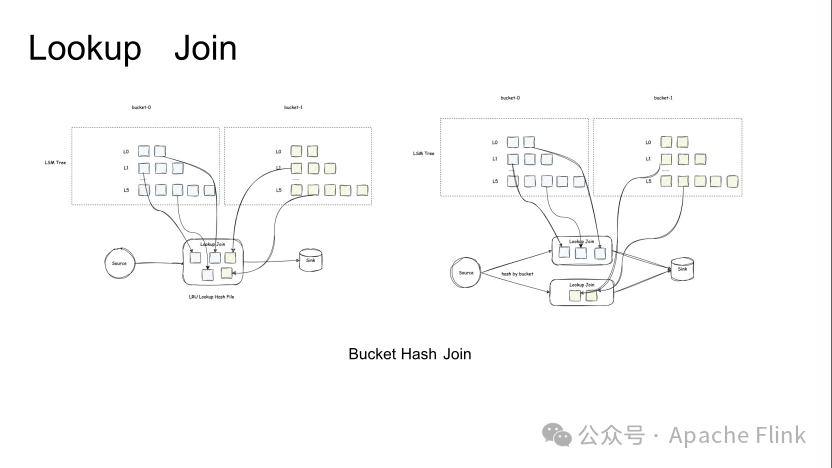 在 Flink 社区也有类似于 Partition Lookup Join 的方式来提高缓存命中率。不过实际验证下来,这种优化模式的效果还是不行,主要是原因是按照 Join key 的这种策略和数据分布不是一一对应的,Paimon 表中的数据是按照 Bucket 来分布的,因此能够提高 Paimon Lookup Join 缓存效率的方式应该是 Bucket Hash Join,也就是类似于上图中所示的左右两种方式。