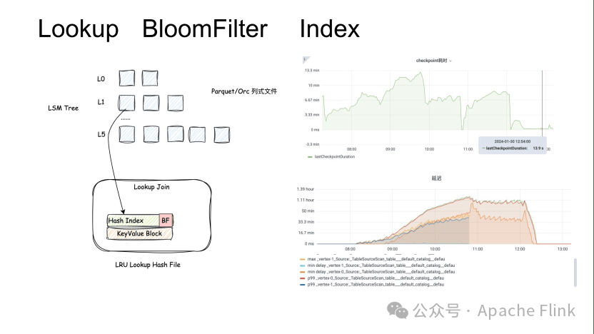 上图右侧所示是first-row场景,也需要通过 Lookup 来做 Changelog 的生成,上线 BloomFilter 索引后,延迟和 Checkpoint 耗时下降明显,整体 Checkpoint更加稳定。