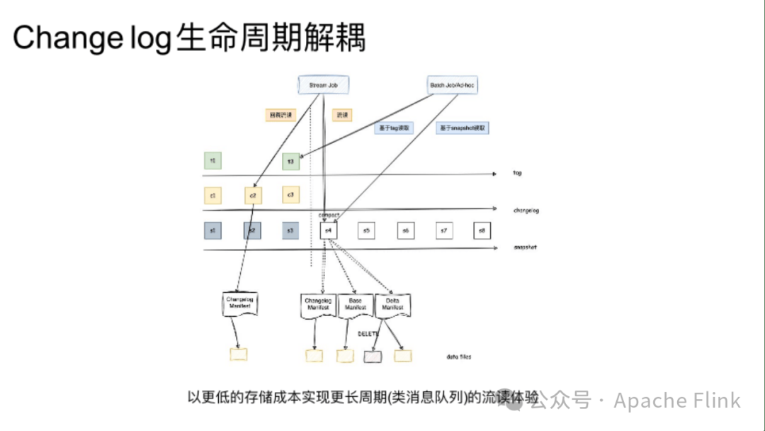 当前解决问题的思路是将 Changelog 和 Snapshot 的生命周期解耦,Snapshot 类似于数据库里的当前快照,Changelog 类似于数据库里的 Binlog,在数据库里也可单独配置 Binlog 生命周期。当 Snapshot 过期时,其中的 Data files 就会被清理。如下图,当 Snapshot4 过期时,对应 Delta Manifest 里所指向 Delete 文件就会被自动清理。而其中 Changelog 部分就会被保留,Changelog 的原数据就会被额外的更新在新的 Changelog 元数据中,通过这样达到 Changelog 解耦的目的。对于没有 Changelog,如增量读取的 Delta 文件类型,通过标记文件的来源是 Compaction 还是 Append来判断在是否在 Snapshot 过期的时候要清理这些文件。大致思路就是由 Compaction 生成的文件是可被安全清理的,而 Append 新增的文件只有当对应的 Changelog 元数据过期时候才会被安全清理。Changelog 解耦已经随着 Paimon 0.8 版本发布,欢迎大家试用这个功能。Delta List 解耦的预计要下个版本才能使用。