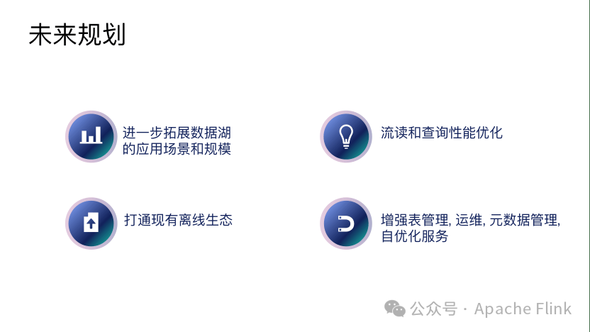 包含进一步拓展数据湖的应用场景和规模,主要会包括流读和查询性能的优化,以及和现有的离线生态打通。这样就可以把现有生态结合起来,并且拓宽后续增量的场景。同时增强表管理, 运维, 元数据管理, 自优化服务。