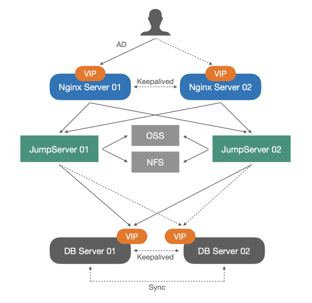 大众酷翼运维团队采用的JumpServer部署方案为高可用架构,当任意一个节点出现故障时,系统可以自动切换至另一节点运行,从而保证了JumpServer的高可用性和系统稳定性。