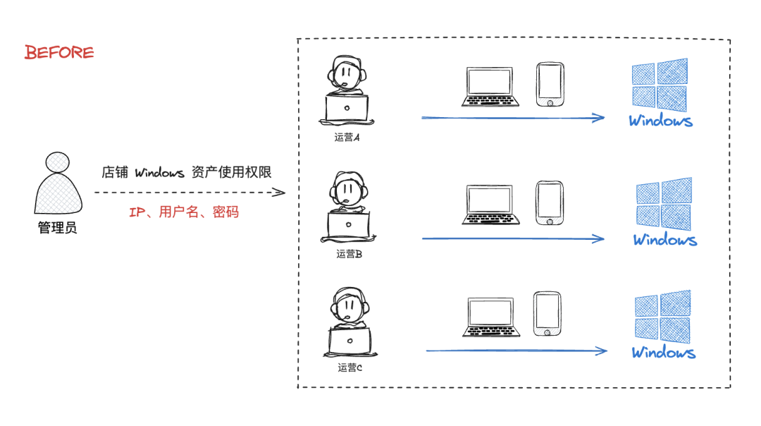 目前,跨境电商公司的信息化建设仍处在起步阶段,店铺运营人员的IT技能较为薄弱。管理人员一般通过Excel表格或其他本地工具来管理公司店铺运营所需要的Windows资产,并且通过直接发送IP地址、用户名、密码这样简单粗暴的方式将Windows使用权限给到运营人员。而运营人员则使用这些明文的IP、账号和密码直接登录Windows资产来运营相关的店铺。