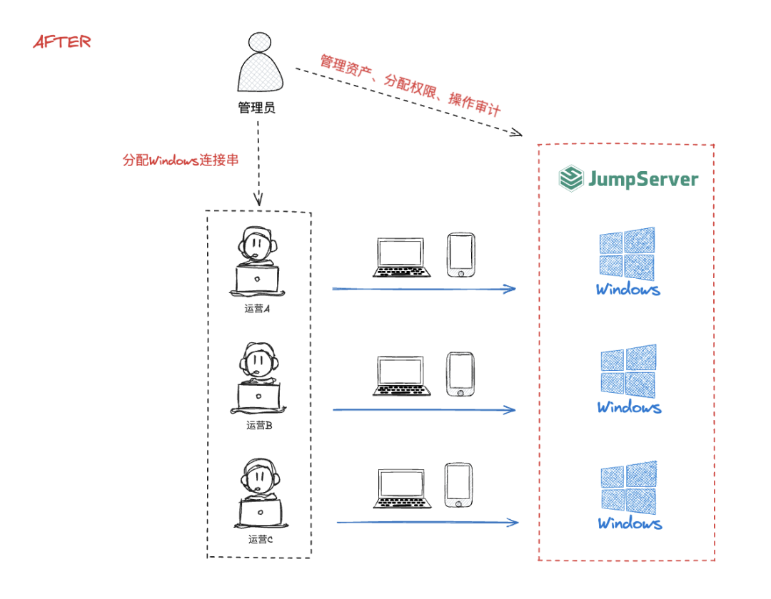 无论在公司内还是在公司外,运营人员都可以通过JumpServer使用PC端、移动端设备安全地连接Windows资产并进行店铺的运营,实现随时随地的办公,有效提升运营效率,促进业务增长;