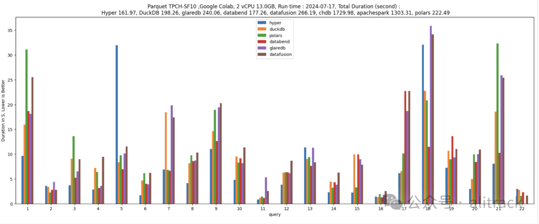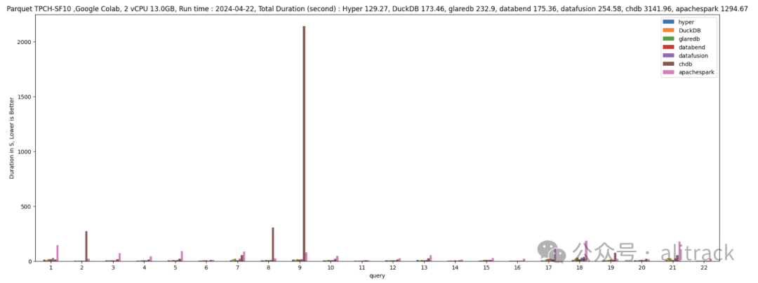 昨天在群里聊到多款OLAP数据库的性能对比,想到之前网上找到的一个benchmark, TPCH_Python_SQL_Engines.ipynb(出处已不可考), 并且为了4月26日的演讲,特意在4月24日跑了一遍,这个是2024年4月24日的对比结果。