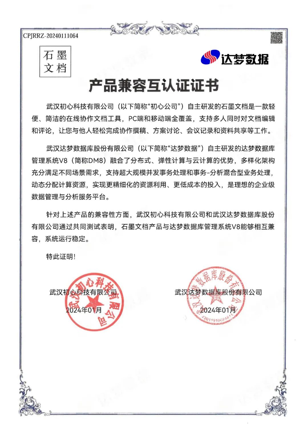 近日,武汉达梦数据库股份有限公司(简称“达梦数据”)自主研发的达梦数据库管理系统V8与武汉初心科技有限公司(简称“初心公司”)自主研发的石墨文档,完成兼容性适配认证,测试结果表明,达梦数据库管理系统V8与石墨文档产品能够相互兼容,系统运行稳定。