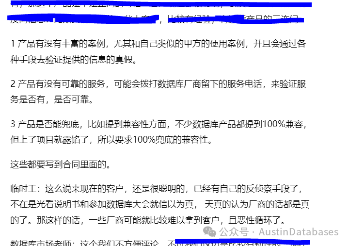 看到这里可能,可能会有一些问题悠然而生,比如不这么做市场我怎么做,不去参加数据库大会怎么宣传自己,不去台上念广告,怎么告诉大家我的产品有多好,等等这些问题,在这篇文章前几个版本的确有提到这些问题的新思路,以及市场老师对这些问题的新的解读, 比如下面的原文的截图,关于谈到现在客户的一些对数据库产品的做法
