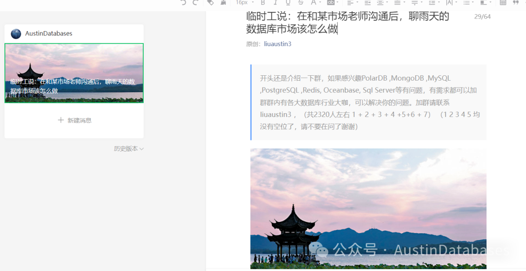 开头还是介绍一下群,如果感兴趣PolarDB ,MongoDB ,MySQL ,PostgreSQL ,Redis, Oceanbase, Sql Server等有问题,有需求都可以加群群内有各大数据库行业大咖,可以解决你的问题。加群请联系 liuaustin3 ,(共2320人左右 1 + 2 + 3 + 4 +5+6 + 7) (1 2 3 4 5 均没有空位了,拉人也不行,请直接私信我去6群,请不要在问了谢谢)