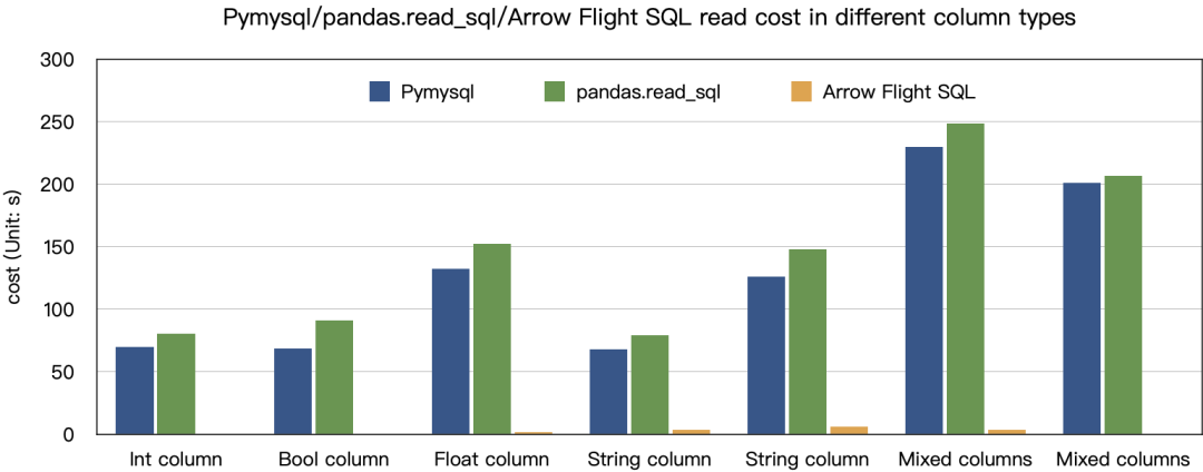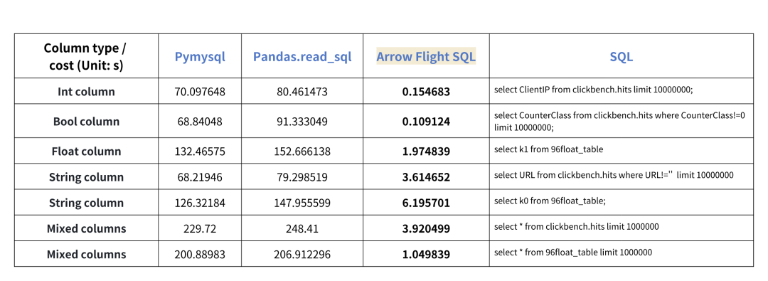 分别使用 Pymysql、Pandas、Arrow Flight SQL 对不同类型数据的传输进行了测试,测试结果如下: