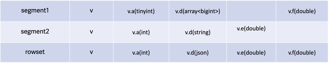 Variant 中的叶子节点是以列存的方式存储在 Segment 文件中,与静态预定义的列存储格式完全相同。因此,可以直接利用预定义列的优化技术,例如字典编码、向量化和索引(ZoneMap、倒排、BloomFiter 等)进行查询加速。由于相同的列在不同文件中可能具有不同的类型,因此在查询时需要用户指定一个类型作为 hint,例如下面的查询示例: