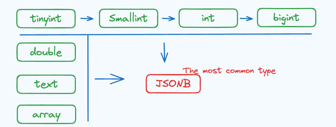 最终 ,Rowset 将使用最小公共列模式(Least Common Column Schema,即子列最多、子列类型是所有 Segment 最小公共类型的 Schema )作为合并后的元数据,从而实现列动态扩展、类型变更。因此,对于 Variant 来说,其存储的 Schema 可以认为由数据驱动产生,与 Doris 中传统的 Schema Change 流程不同,具备更大的灵活性。下图展示了类型变更的方向(只支持按箭头所指方向进行变更,JSONB 类型是所有类型的公共类型):