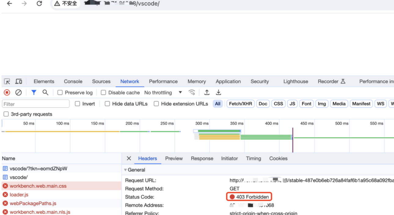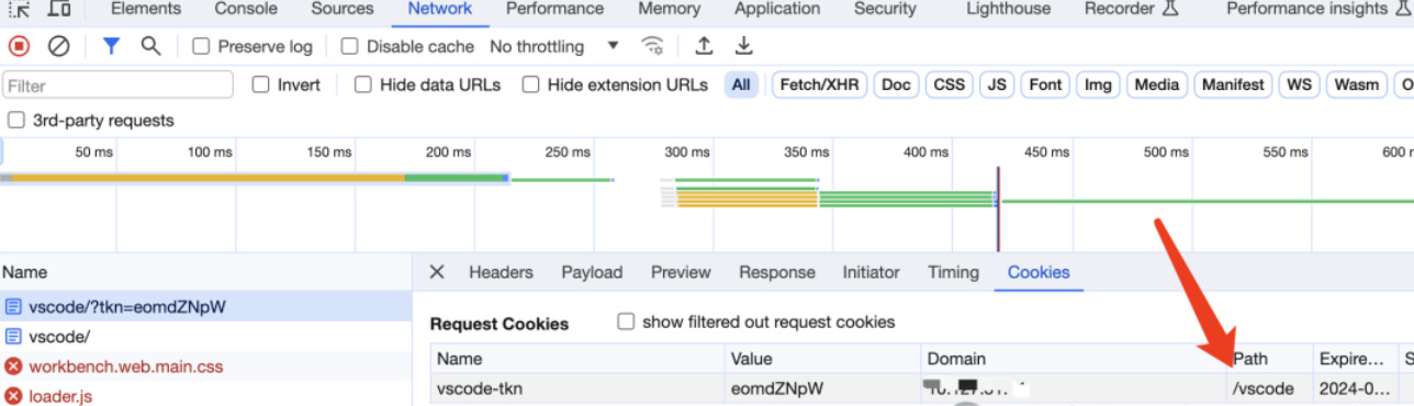 也就是第一次请求应用的时候,应用的响应头里带了 Set-Cookie: vscode-tkn=eomdZNpW;,因此第二次浏览器请求 /vscode/xxx 的时候就会带上这个 Cookie,但是静态资源在 /stable-xxx/static 下,由于路径不一致(也不是包含关系),因此第二次请求的 Cookie 就没了。