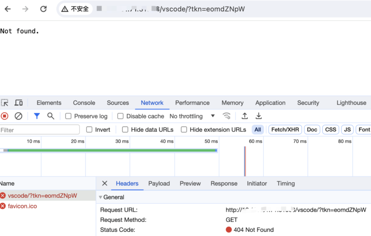 404 说明流量已经到了应用,但是路径不对。稍加思考,其实是 Pod 收到了一个路径为 /vscode 的 http 请求,但是 Pod 期待的第一个请求路径是 /,404 合情合理。