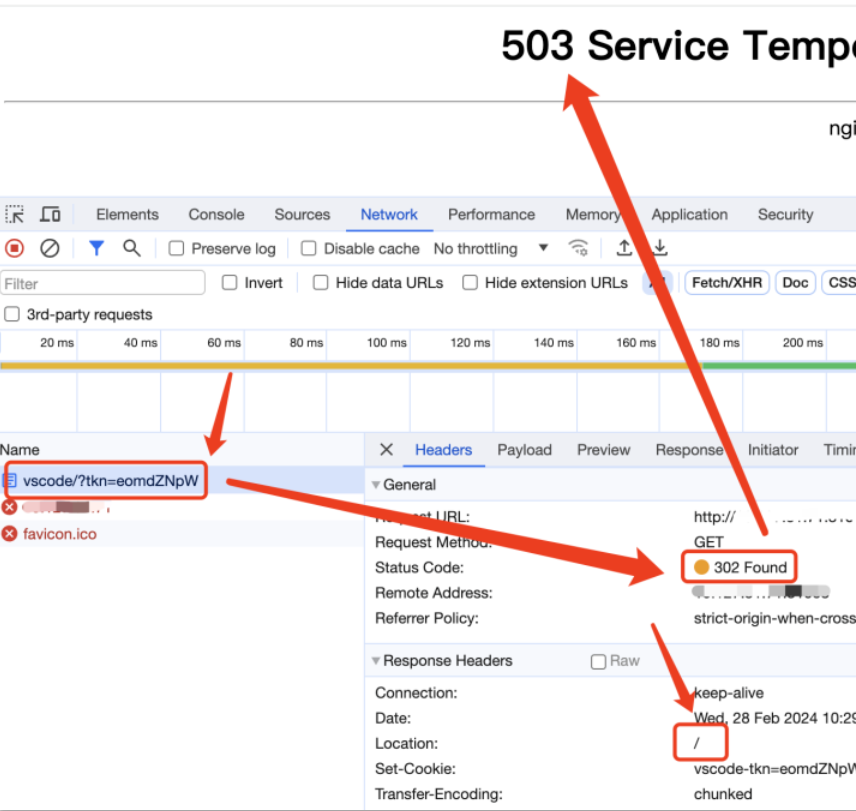 浏览器上首先看到的是 503 错误,但是第一个请求不应该 503。进一步看可以发现服务端先响应了一个 302,将请求重定向到了 / 路径,进而第二个请求发到了 /,在 Ingress 这一层被拦截了,返回 503。