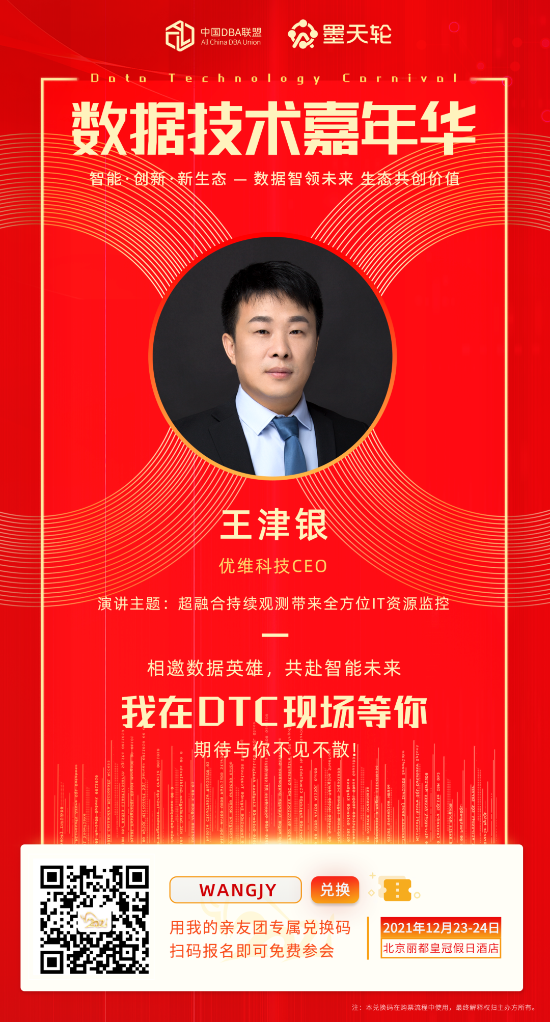 关于超融合持续观测解决方案和国产数据产品,王津银还有哪些见解和观点?快来现场寻找答案吧!即日起,扫描下图二维码,使用王津银亲友团专属兑换码(WANGJY)即可领取2021数据技术嘉年华“免费门票”。