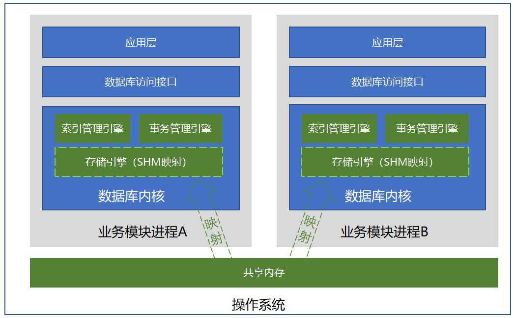 KSMDB是嵌入式内存数据库(IMDS),应用层通过数据模型相关的API访问数据。KSMDB整体架构如图所示,主要结构组成部分包括索引管理引擎、事务管理引擎、存储引擎。索引引擎维护数据模型定义的索引结构,支持红黑树索引、HASH索引。事务管理引擎管理业务层数据访问的一致性和并发处理。存储引擎管理数据和索引在内存的存储,支持在进程堆内存和共享内存保存数据。