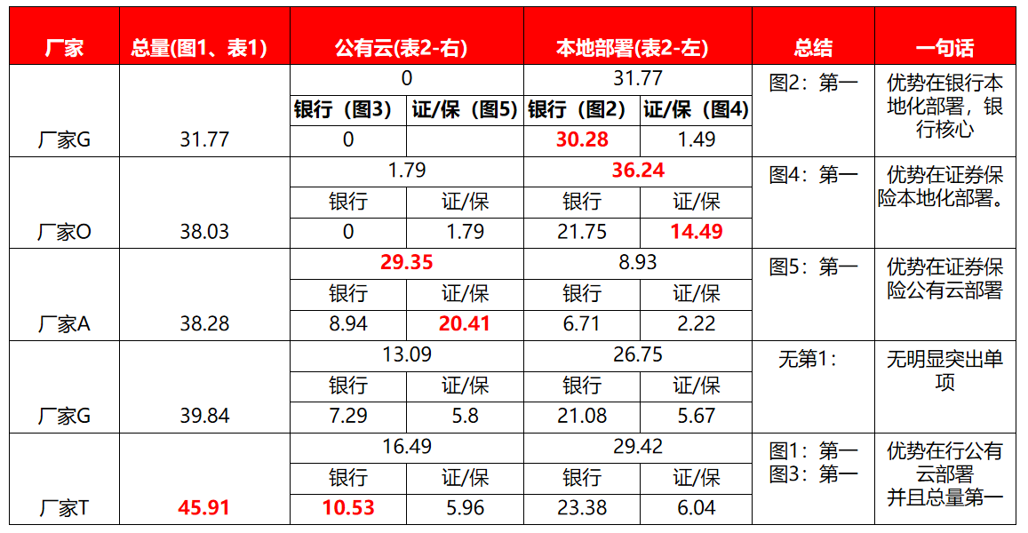 3)在银行本地部署方面,厂家G凭借在建行、工行等案例以及 9 个股份制等大型银行案例,在这个领域处于领先地位。