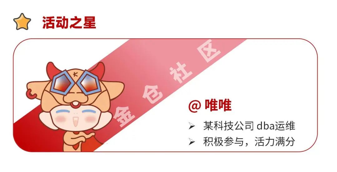 ✨金仓社区的蓬勃壮大,凝聚着每一位成员卓越贡献与热情参与。在这段意义非凡的百日征途中,社区内涌现出众多杰出用户,他们凭借扎实的技术功底、积极的互助精神、满腔的热血与激情共同推动着社区破浪前行。其中,4位杰出的伙伴凭借他们出类拔萃的表现,在众多星辰中脱颖而出。