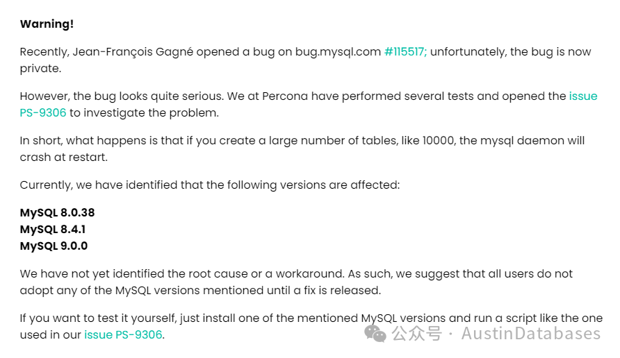 根据Percona的BLOG中的文章显示,当前他们发现MYSQL 8.037后面的版本均存在BUG,当表的数量超过 10000 张后,对应版本的MYSQL会系统崩溃,并进行重启。当前发现的的 8.038, 8.4.1, 9.0 均存在此问题。
