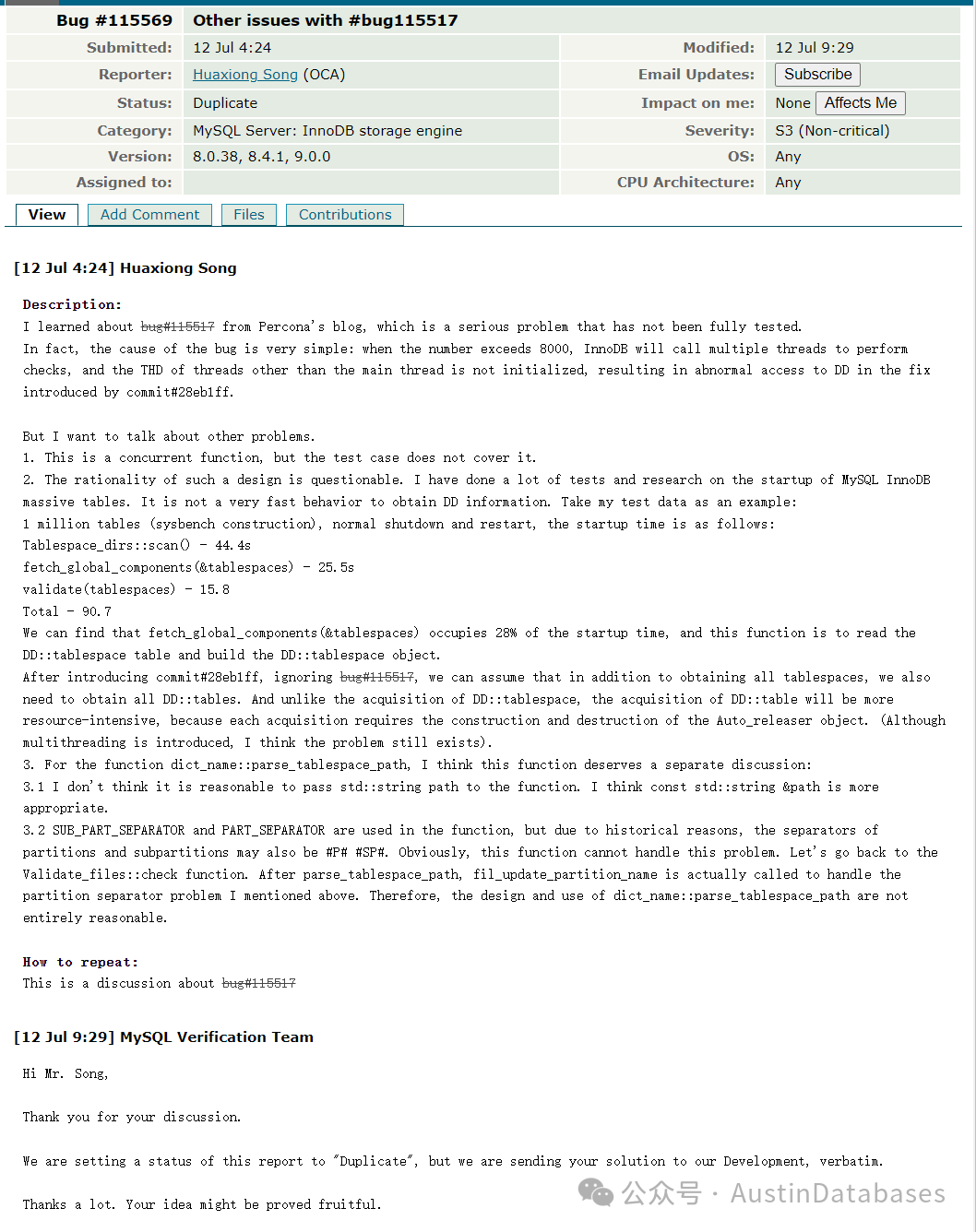 另某云厂商 RDS 核心团队的成员 Huaxiong Song,报告了此次问题给MYSQL官方,具体的翻译内容如下