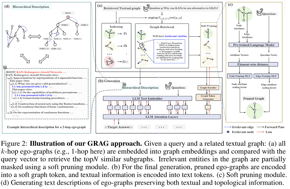 具体来说,GRAG模型采用了一种双重提示策略,即硬提示和软提示。如图2(d)所示,硬提示将检索到的子图转换为层次化的文本描述,保留拓扑信息和语义细节。如图2(c)所示,检索到的子图在剪枝过后通过GNN聚合文本和拓扑信息生成图token,随后用于引导大语言模型的生成过程。