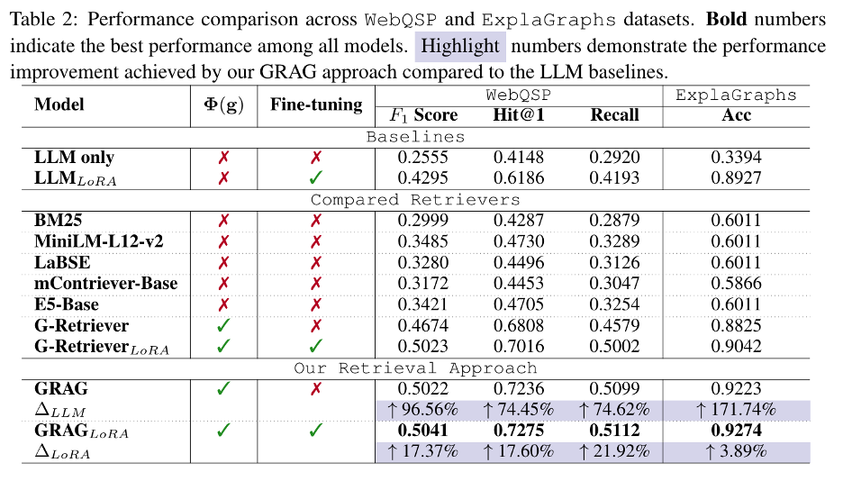 如表2所示,GRAG方法在WebQSP和ExplaGraphs数据集上的各项指标上均取得了最佳性能。在WebQSP数据集上,GRAG方法的Hit@1指标显著高于其他方法,在ExplaGraphs数据集上的准确率也同样表现出色。