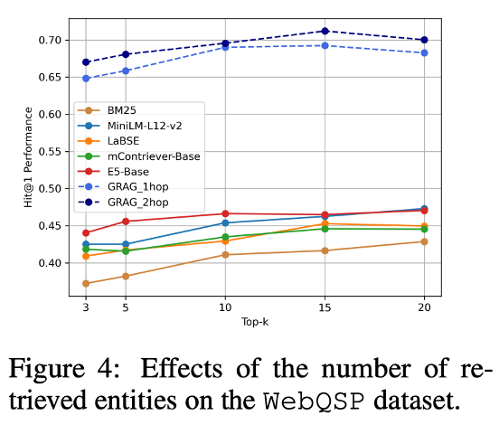 如文中图四所示,随着检索子图数量的增加,生成效果在一定范围内不断提升。例如,在WebQSP数据集上,从3个子图增加到15个子图,生成的Hit@1得分明显提高。然而,进一步增加子图数量到20个后,性能提升变得不明显,甚至出现轻微下降。这表明,过多的检索结果可能引入冗余信息,反而对生成结果产生负面影响。